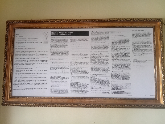 The image presents a large, rectangular, gold-framed document mounted on a plain, light-colored wall. The ornate frame features carved details. The document itself is a printed text labeled "Privacy Notice - Nigeria," with a subheading "Updated April, 2021." The content, displayed in black text on a white background, outlines privacy terms and conditions. Specific sections within the visible text explicitly reference "Jos, Plateau State" and "Amu Lodge, Amu, Amu, and Amu, Jos, Plateau State," indicating the notice's relevance and location context within the city of Jos, Nigeria. No individuals, interactions, or discernible actions are present in the scene, which depicts a static indoor environment.