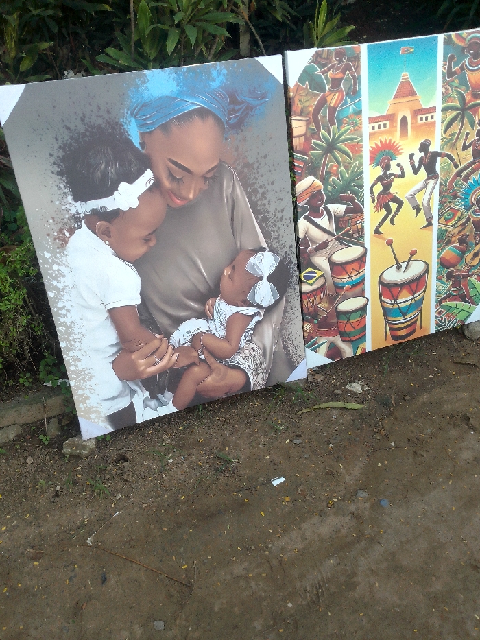 Two large canvases stand outdoors on the ground. The left canvas portrays a woman in a headscarf holding two young children. The right canvas displays a vibrant, colorful scene with dancers, drummers, and architecture, all rendered in an illustrated style. The backdrop behind the canvases features lush green plants. The ground around the canvases is a mix of dirt, grass, and scattered debris.