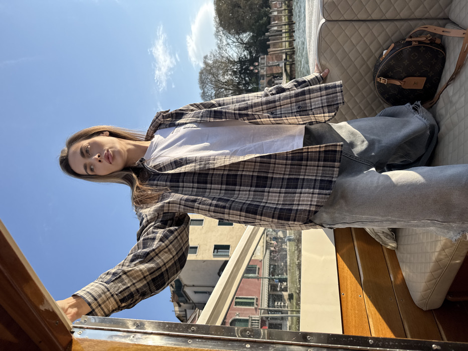 A female individual stands on a boat navigating a canal in Venice, Italy, under a clear blue sky with minimal cloud cover. The woman, with long brown hair, is positioned in the foreground, facing towards the right with her head slightly tilted upwards and to the right. Her right arm is raised, with her hand holding onto a wooden and metallic frame element of the boat's interior. Her left hand rests on the light-colored, quilted upholstery of the boat's seating. She is wearing a white t-shirt underneath an open, long-sleeved plaid flannel shirt in shades of brown, black, and beige, and loose-fitting, light-wash denim jeans with distressed hems. A brown Louis Vuitton handbag with a monogram pattern and a leather strap rests on the quilted seat next to her on the right side. The boat's interior features polished wooden panels, a chrome rail, and the aforementioned light-colored, quilted seating. Through the boat's open side or window, the canal's waters are visible, along with historical Venetian architecture lining the waterway in the midground. These buildings include multi-story structures with various colored facades (reddish, beige, brown) and windows. In the background, trees without leaves are visible, and several wooden mooring posts are submerged in the water along the canal's edge, characteristic of Venetian waterways. The scene is illuminated by strong sunlight, casting distinct shadows on the boat's interior.