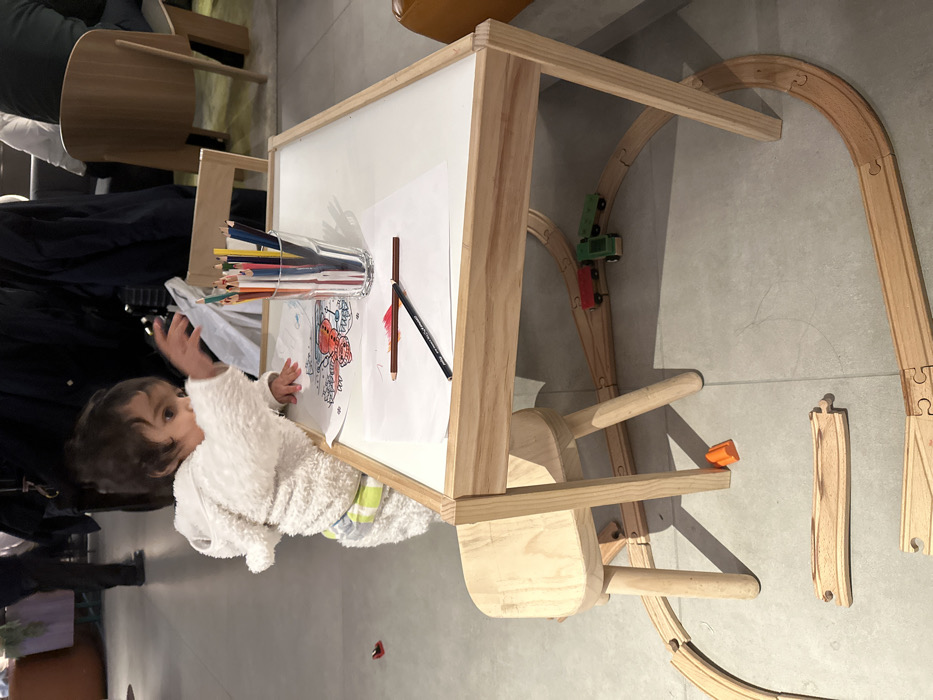 A young child in a white fuzzy jacket sits at a wooden table with a white top, reaching towards a glass filled with colored pencils. A drawing lies on the table. A wooden train track curves around the table legs, with a green and red toy train on the track and additional track pieces nearby. A small wooden chair is tucked under the table.