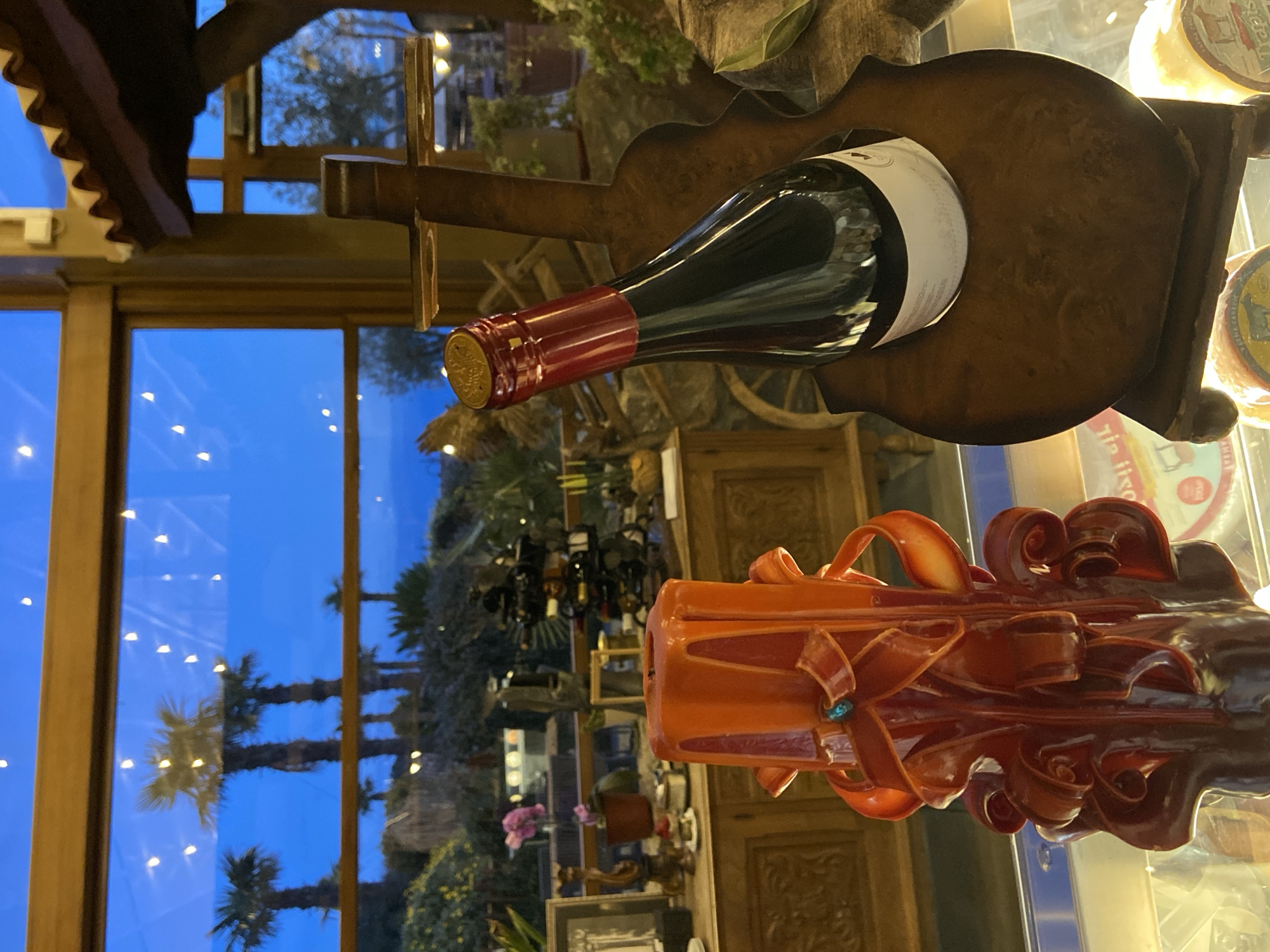 bottle of wine in a wooden holder next to an ornate orange candle on a glass shelf. Outside the window, palm trees are visible against a blue sky. In the background, there are wooden doors and a chandelier. The location may be Kovačko Polje, Montenegro.