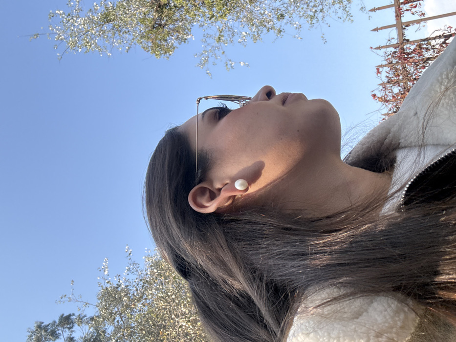 A woman's low-angle portrait shows her looking up at a clear blue sky partially obscured by tree branches and a structure. She wears glasses pushed slightly on her face and a white pearl earring. Her brown hair cascades around her face. She is wearing a white, textured jacket with a visible zipper. A shadow falls across her face.