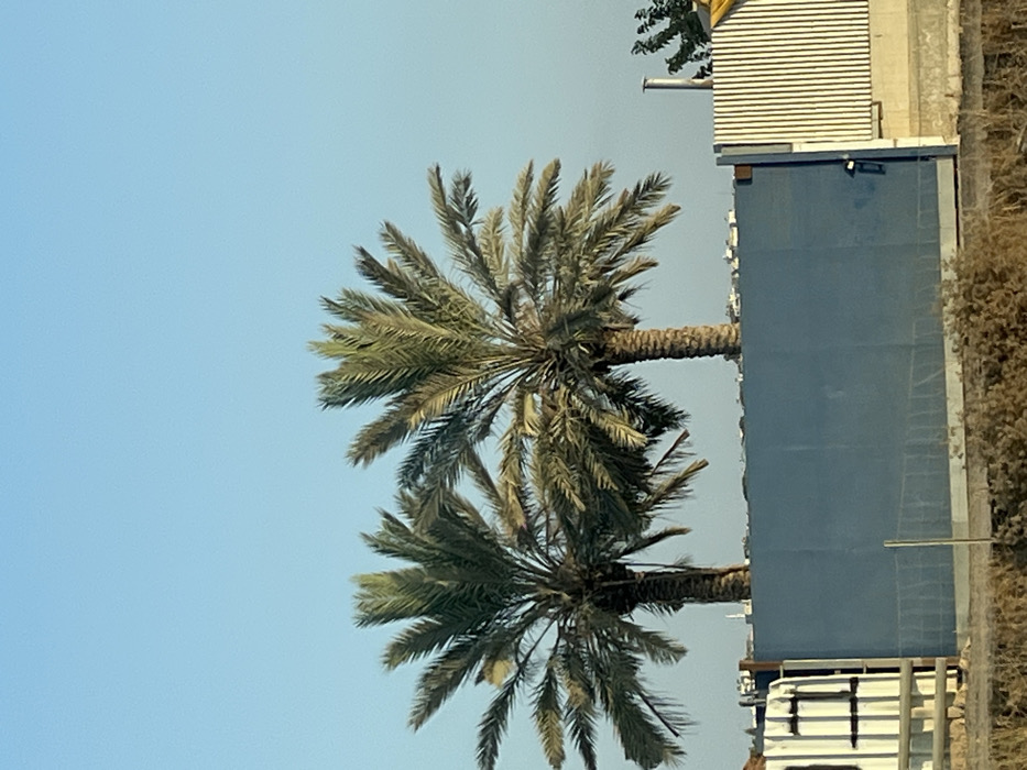 The image depicts an outdoor scene in Kafr Kasim, Israel, under a clear, light blue sky. Two mature date palm trees (Phoenix dactylifera) with thick, textured trunks and dense crowns of green-to-olive fronds dominate the midground. The tree on the left is slightly shorter than the one on the right. Below the palm trees, a multi-panel barrier separates the foreground from the background. This barrier includes a large, dark blue solid metal gate positioned centrally, featuring a visible handle/latch mechanism on its right edge. To the immediate left of the blue gate is a white corrugated metal panel with two dark hinges on its left side. To the right of the blue gate, another section of white corrugated metal fencing is present, behind which a dark, cylindrical vent pipe extends vertically above the fence line, partially obscured by the right palm tree. The immediate foreground consists of dry, light brown ground cover, with a thin dark vertical pole located in the lower center, in front of the blue gate. In the distant background, visible above the barrier and between and behind the palm trees, are numerous white, flat-roofed buildings consistent with an urban settlement. A faint structure resembling a minaret is discernable behind the upper left portion of the left palm tree. No individuals or active subjects are visible in the scene.