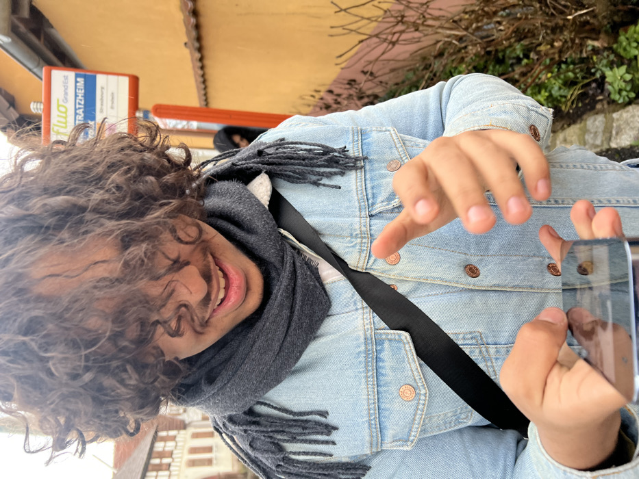 A male individual is depicted in a close-up, outdoor scene at a bus stop in Meistratzheim, France. The subject, positioned centrally, has dark, curly hair obscuring most of his forehead and eyes. He is smiling, with a mustache and his mouth slightly agape, revealing teeth. He wears a light blue denim jacket with copper-colored buttons and a dark grey fringed scarf. A black strap, likely from a bag, crosses his chest diagonally. He holds a dark smartphone horizontally in his left hand, its screen reflecting ambient light, while his right hand is poised above the device with fingers splayed. In the upper right background, a blue and white "Fluo GrandEst" bus stop sign is clearly visible, displaying "MEISTRATZHEIM" at the top, with "Strasbourg" and "Erstein" listed below. Behind this sign, an ochre-yellow building with a tiled roof is present. To the left of the main subject, a traditional half-timbered building with light-colored walls and dark wooden beams is partially visible. Sparse, dry vegetation is visible in the lower right and mid-right background. A second, out-of-focus individual, clad in dark clothing, is partially visible behind the main subject's right shoulder near the bus stop sign. The scene is illuminated by diffused daylight, indicating an overcast sky.