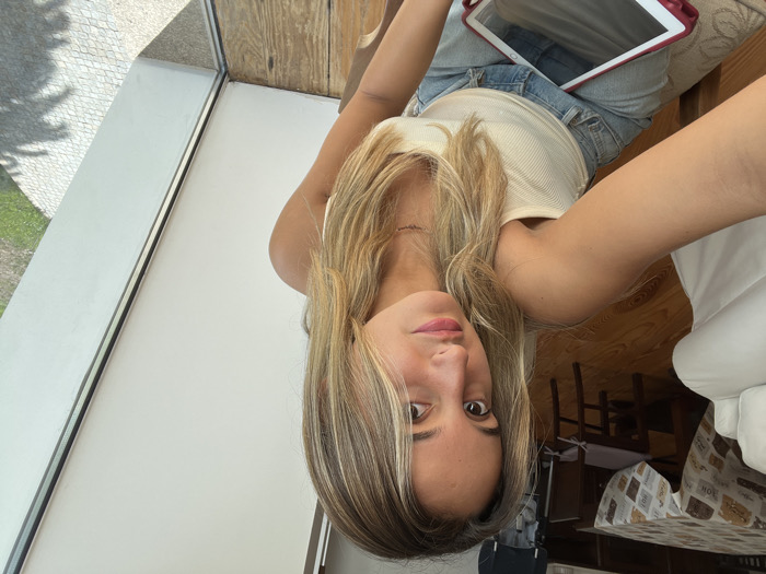 The image displays a young female individual indoors, captured in a selfie perspective, in a residential setting within Oliveira de Frades, Portugal