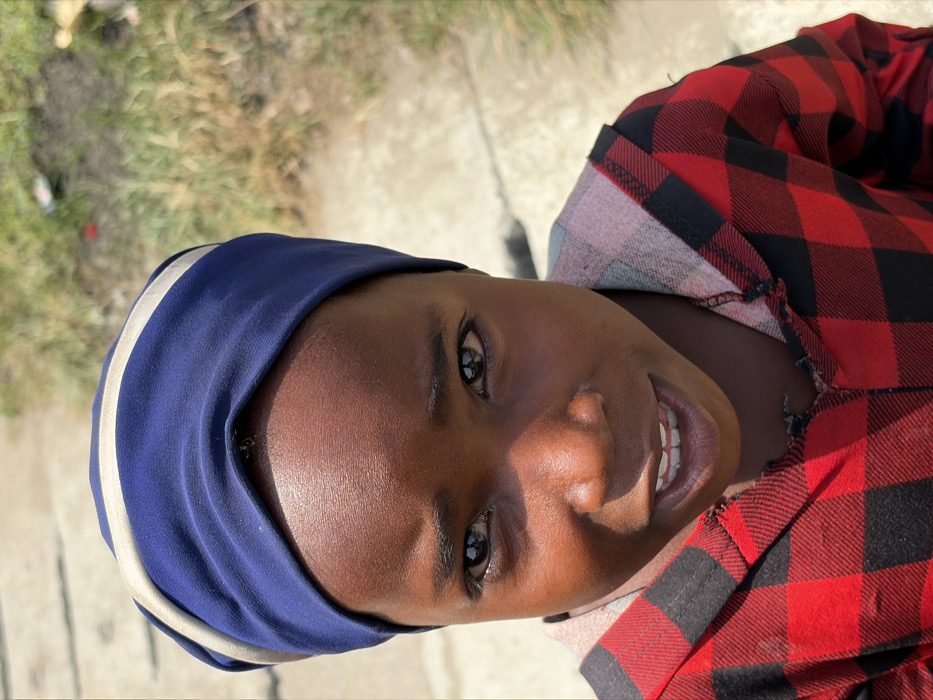 A close-up image captures a young individual, likely a child, positioned outdoors in Jakande, Nigeria. The subject, with dark skin, directly faces the camera, exhibiting a slight upward gaze and a partial smile revealing upper teeth. They wear a navy blue head covering with a light-colored horizontal stripe across the forehead, possibly cream or beige. Below the head covering, a red and black checkered long-sleeved garment, appearing to be a shirt or jacket, is visible, with fraying evident around the neck/collar area. The background features a light-colored concrete surface, likely a path, on the left and a patch of dry, sparse green grass on the right. Bright sunlight illuminates the scene, casting highlights on the subject's forehead and eyes. No other individuals or objects are clearly identifiable in the immediate vicinity.