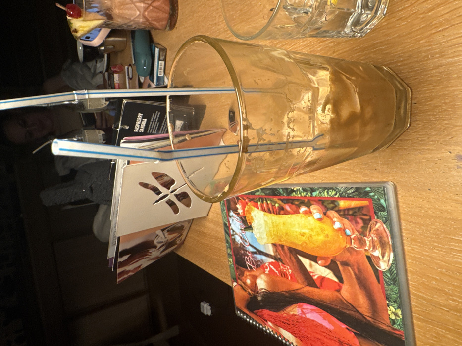 The image depicts an indoor scene within a café or bar in Pleven, Bulgaria. The foreground is dominated by a light brown wooden table surface. On the left, a spiral-bound menu booklet titled "Be Cool" features a graphic of a person's hand holding a yellow cocktail. Centrally positioned is a tall, clear octagonal glass containing a small amount of a brown, viscous liquid, indicating a partially consumed beverage. Two blue and white striped plastic straws are submerged within this glass. To the right of this, a portion of a smaller, clear faceted glass is visible. In the midground, behind the central glass, a white stand-up menu or brochure with a decorative dragonfly cut-out is present. A black tag attached to this menu displays "RASPBERRY SANGRIA." Further to the right, another cocktail is visible in a patterned glass, garnished with a pineapple wedge and a red cherry. Several other small objects are scattered on the table surface, including what appears to be a pack of cigarettes and a lighter. The background is dimly lit and out of focus. A seated individual, likely female, is partially visible at a table, looking downwards, possibly at a mobile device. The seating appears to consist of dark upholstered furniture, contributing to a muted, relaxed ambiance.