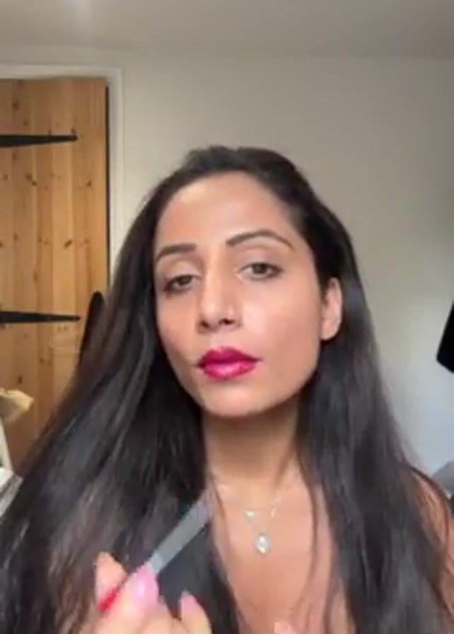 A woman with long, dark hair is applying dark red lipstick