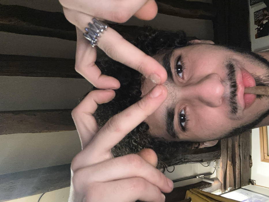 A male individual is depicted in a close-up, indoor setting, identified as being in Palaiseau, France. The subject has dark, curly hair, dark eyes, and facial hair comprising a beard and mustache. His hands are raised above his head, forming a heart shape with his fingers. A silver-toned ring featuring multiple parallel segments is worn on the ring finger of his right hand. A cigar or dark, rolled smoking implement is positioned between his slightly pursed lips. The background prominently displays dark, exposed wooden ceiling beams against lighter-colored wall or ceiling surfaces. A yellow textile element is partially visible on the left side of the frame, and a portion of a framed object is visible in the bottom right corner.