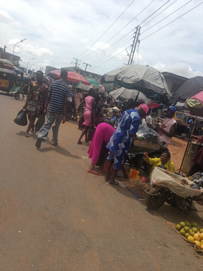 - "The image depicts an active outdoor market scene on a dirt or worn asphalt road in Unguwar Kaya, Nigeria, under an overcast sky" by FM-lyk6B2, licensed under CC BY 4.0