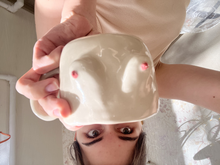 The image displays a woman in an indoor setting, identified as Saint Petersburg, Russia. She is positioned centrally, viewed from the mid-torso upwards, holding a light cream-colored ceramic mug featuring sculpted breasts with prominent pink-red nipples. Her dark hair is pulled back, and her brown eyes look directly at the viewer over the top edge of the mug, which is held by her right hand, fingers wrapped around the handle. She wears a light beige ribbed top. A small dark mole is visible on her left upper arm. The background on the left features light-colored patterned wallpaper with sunlight casting shadows. On the right, a plain light-colored wall includes visible white pipes and a partial view of a window area with an orange hanger. A white plastic bag is partially visible in the lower-left corner. Strong natural light illuminates the scene from the right side.