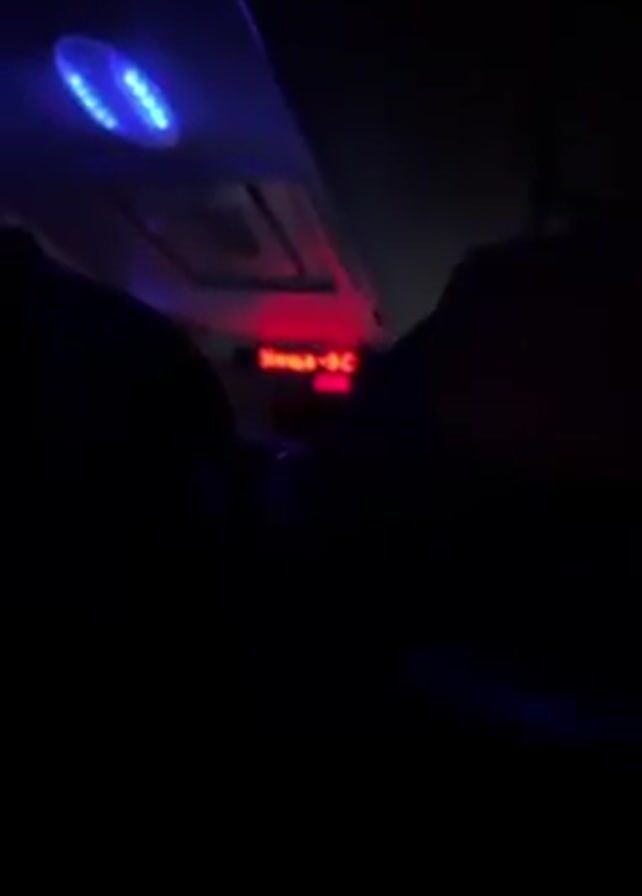 n interior view of a vehicle, possibly a bus or train, at night