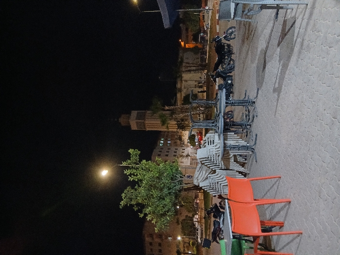 A night scene depicts stacked chairs, tables, and a parked motorcycle on a paved surface. A distant building, likely a mosque with a tall minaret, stands illuminated against the dark sky. Streetlights and illuminated buildings add to the overall ambiance.