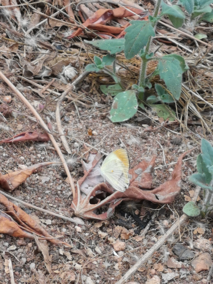 The scene depicts a close-up, ground-level view of an outdoor environment in Owa-Aliosimi, Nigeria. The ground consists of granular, light brown soil mixed with small stones and scattered organic debris. Several dry, brittle, reddish-brown leaves, some curled, are dispersed across the frame, notably a large one in the lower center. Thin, dry sticks and plant stems are also present, intermingled with white, fluffy seeds (achenes). In the upper right and central-right, a small, vibrant green plant with multiple ovate leaves and a hairy stem grows upwards from the soil. A butterfly, primarily light yellow or off-white with an orange-yellow margin on its visible dorsal wing, is resting with its wings folded vertically on the large, dry, reddish-brown leaf in the lower center of the image. A small, reddish-brown insect is visible on the soil in the mid-left portion of the frame. No human subjects are present.