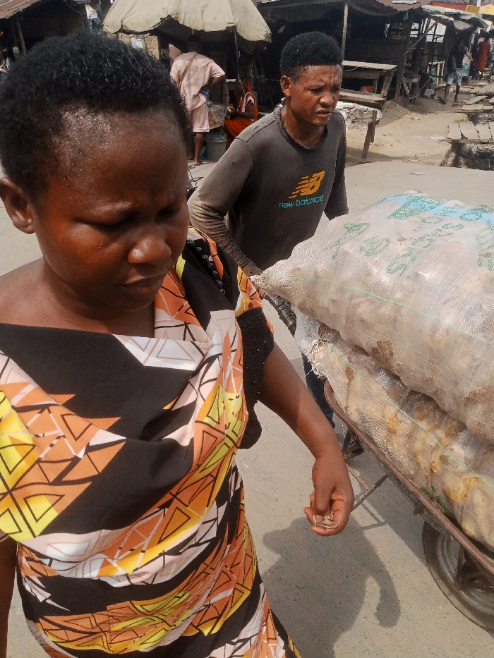 The image depicts an outdoor market street in Aba, Nigeria, under bright daylight. In the left foreground, an adult female with dark skin and short, dark, textured hair wears a black dress with orange, yellow, and white geometric patterns. Her head is angled downwards, with her eyes focused on her right hand, which is slightly clenched and contains a small quantity of light-colored seeds or grains. A black beaded accessory is visible on her left shoulder. In the mid-ground to the right, an adult male with dark skin and short, dark hair wears a dark grey t-shirt featuring a "new balance" logo. He is pushing a two-wheeled handcart laden with two large, transparent white mesh bags filled with bulky, off-white produce, consistent with root vegetables. His gaze is directed slightly to his right. The background reveals a bustling market environment with an uneven, possibly unpaved, ground surface. Various rudimentary market stalls are visible, constructed from wooden frames, corrugated metal sheeting for roofs, and some feature light-colored fabric awnings or umbrellas. Several indistinct figures populate the background among the stalls, indicating commercial activity. Strong shadows are cast on the ground, suggesting overhead sunlight.