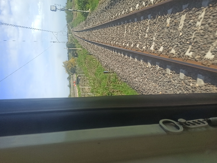 - "The image captures a railway track scene from the interior of a moving train, partially obscured by a beige-colored train panel and silver latch mechanism on the left foreground" by FM-u5tDi1, licensed under CC BY 4.0