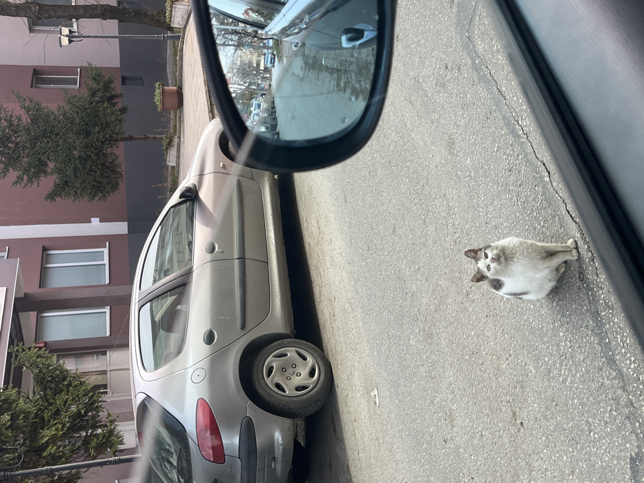 - "An urban street scene in Pleven, Bulgaria, captured from inside a vehicle, depicts a white and grey/brown patched cat seated on asphalt pavement" by FM-r9NoC2, licensed under CC BY 4.0