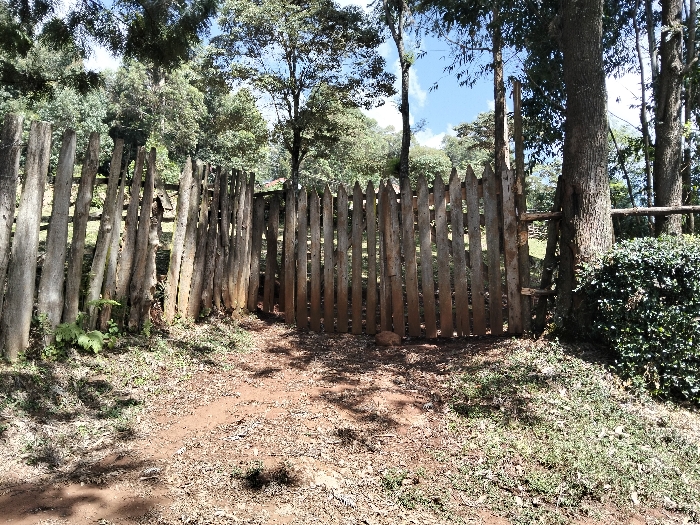 The image displays an outdoor scene in Nyansiongo ward, Kenya, featuring a rustic wooden fence and gate structure
