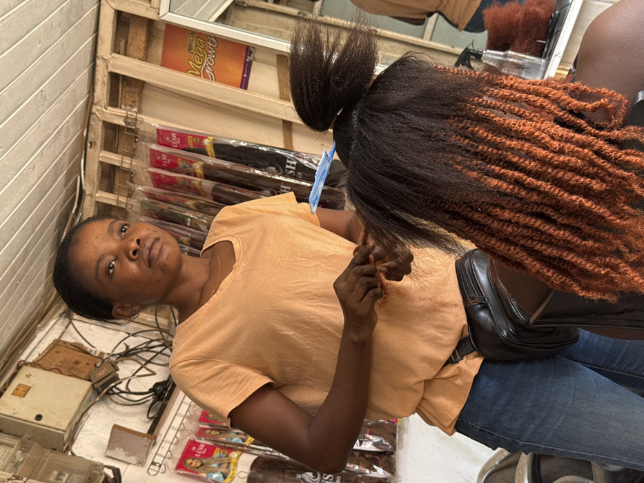 The image captures an indoor hair styling session at a commercial establishment in Abuja, Nigeria