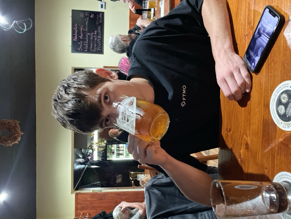 A young adult male with short dark hair, wearing a black t-shirt with a white "FTMO" logo on the left chest, is seated at a polished wooden table within a pub or restaurant. He is actively drinking from a clear glass mug containing a foamy, amber-colored beverage, likely beer, which he holds with his right hand to his mouth. His left arm rests on the table. On the table in the foreground, there is an empty clear glass tumbler with a dark liquid residue, placed on a white circular coaster featuring text and an illustrated design. To the right, a black smartphone with an illuminated screen displaying "20:49" and other interface elements is resting face-up. A second identical white coaster is partially visible beneath the smartphone. A dark jacket is draped over a chair to the immediate left of the main subject. In the background, several individuals are seated at other wooden tables. To the left, a person with gray hair is partially visible. Further back on the left, a dimly lit area features shelves stocked with bottles and a refrigerator with illuminated contents, suggesting a bar section. To the right, a black chalkboard menu is mounted on the wall, displaying offerings in Czech, including "Nabídka" (Offer), "Sule domácí," "Nakládaný hermelín 89" (Pickled Hermelín cheese, priced at 89), and "RUMBURAK." Patrons with varying hair colors, including pink and gray, are visible in the mid-ground. The interior features light-colored walls in the upper section and a darker ceiling from which decorative elements hang. Based on the Czech language visible on the menu, the scene is located in a pub or restaurant in the Capital City of Prague, Czechia.