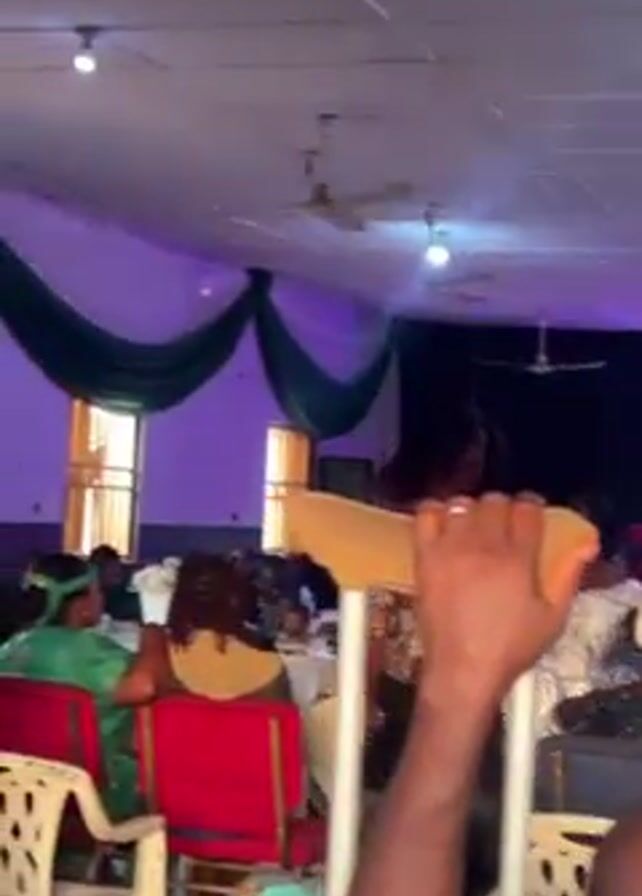 The video depicts a person with crutches filming an event indoors. The event seems to be taking place in a decorated hall, with a stage at one end. People are seated at tables and chairs. A woman walks across the room, between the crutches and the stage, and the camera follows her. There are at least three people on stage, illuminated by colored lights. A baby is being held in someone's arms in the foreground.