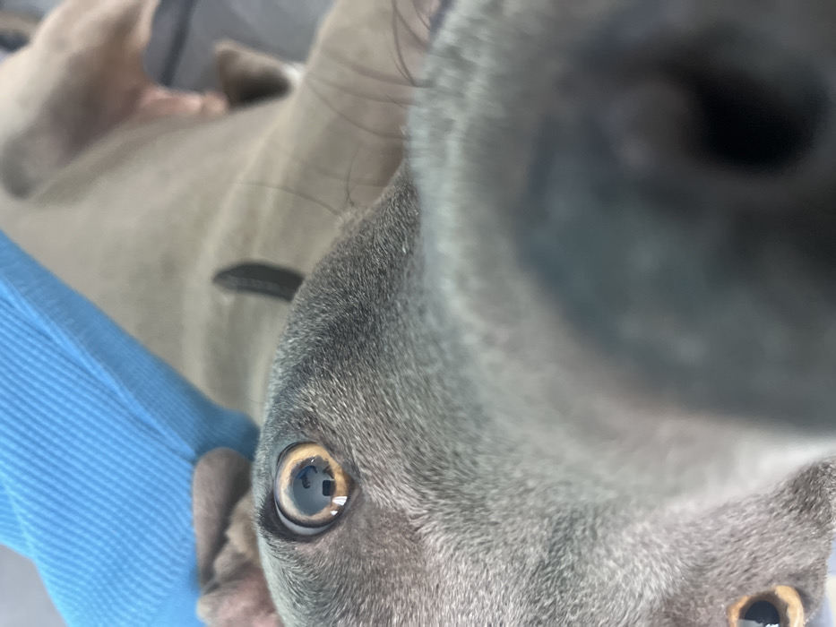 - "An up-close, almost comical view of a gray Italian Greyhound's face dominates the frame" by FM-Wvo0J3, licensed under CC BY 4.0