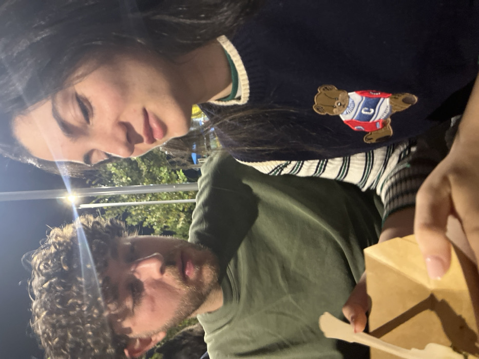 The image depicts two young adults outdoors at night in the city of Modiin-Maccabim-Reut, Israel. A male figure with curly brown hair and a beard, wearing an olive-green long-sleeved shirt, is positioned on the left, looking downwards and to the right. A female figure with long dark hair, wearing a navy-blue sweater vest with a teddy bear emblem over a striped long-sleeved shirt and a green collared shirt, is on the right, also looking downwards and to the left. She holds a light-brown, possibly cardboard, takeout container with a light-colored utensil inside, using her left hand, which has light pink painted fingernails. Both individuals appear focused on the container. The background is dark, illuminated by a bright artificial light source causing lens flares, with blurred trees and faint structures visible behind them.