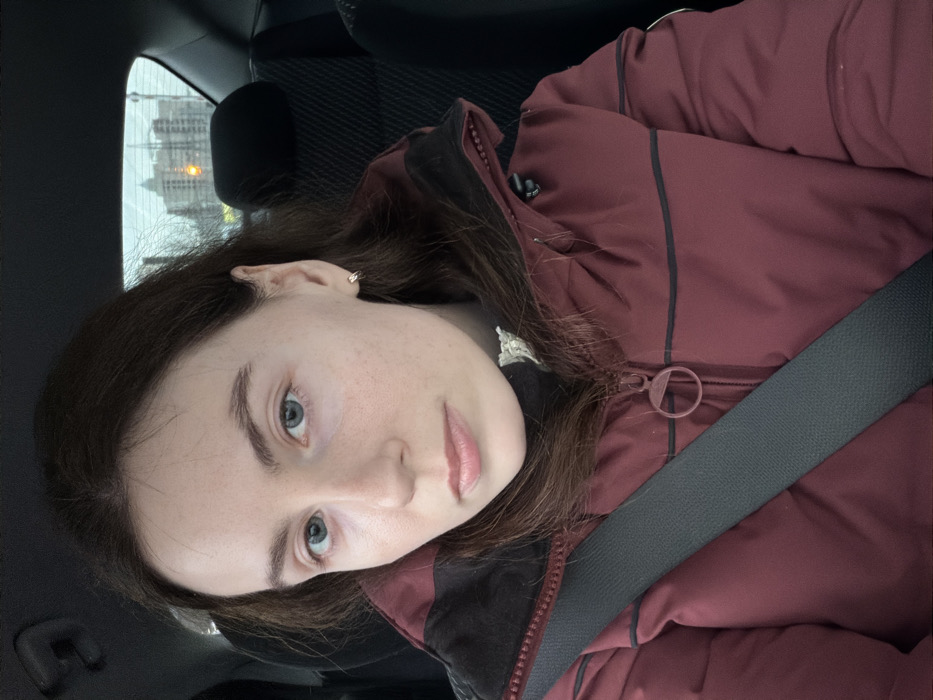 - "A young female with fair skin, light blue eyes, and long, dark brown hair parted in the middle is positioned centrally, looking directly at the camera" by FM-Opnib2, licensed under CC BY 4.0