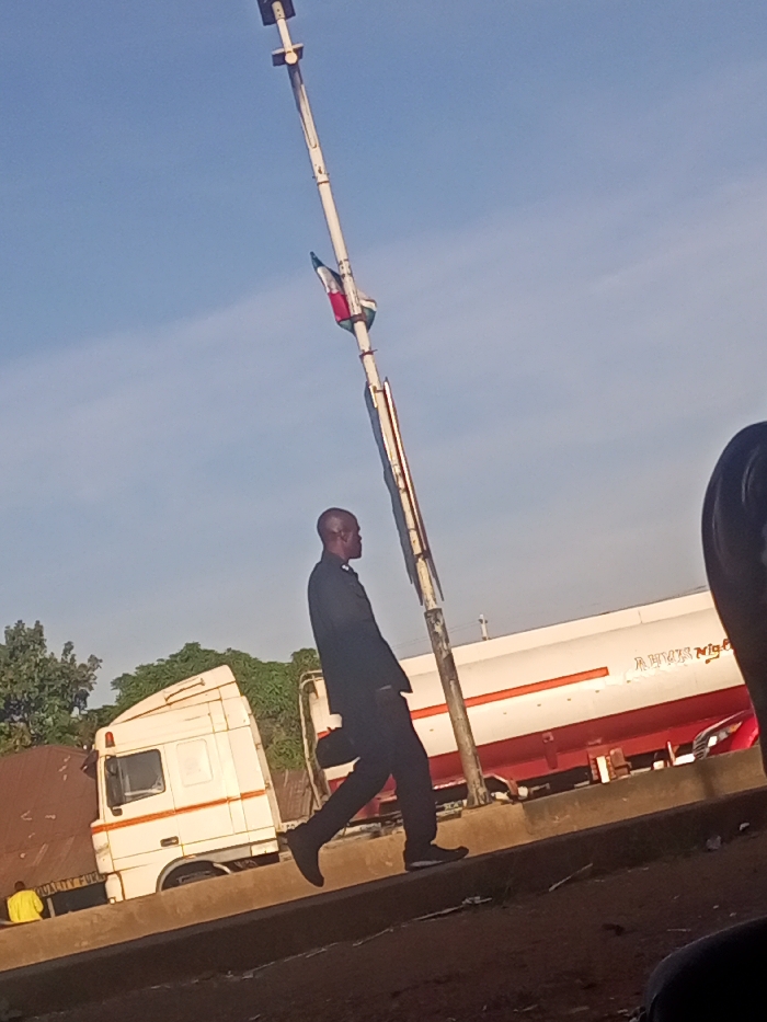 An outdoor, daytime scene in Jos, Nigeria, depicts an adult male walking past large commercial vehicles under a clear blue sky. The dark-skinned male, bald and wearing dark trousers, a dark long-sleeved shirt, and dark athletic shoes, is captured in profile, mid-stride, moving from right to left. A tall, slender white pole, possibly a street light or signpost, dominates the central frame, featuring a small tri-color flag (green, white, and a reddish hue) attached midway up. Behind the walking individual, a large white tanker truck with a prominent red horizontal stripe along its lower side is parked or stationary. The text "AHWK Nig" and "Quality Fuels" is visible on the tanker's side. To the far left, the white cab of a semi-truck is partially visible, with green foliage from trees or bushes in the background. A dark, low concrete barrier or curb runs horizontally across the foreground, separating the viewer's perspective from the main road level. The environment suggests an active commercial or industrial roadside.