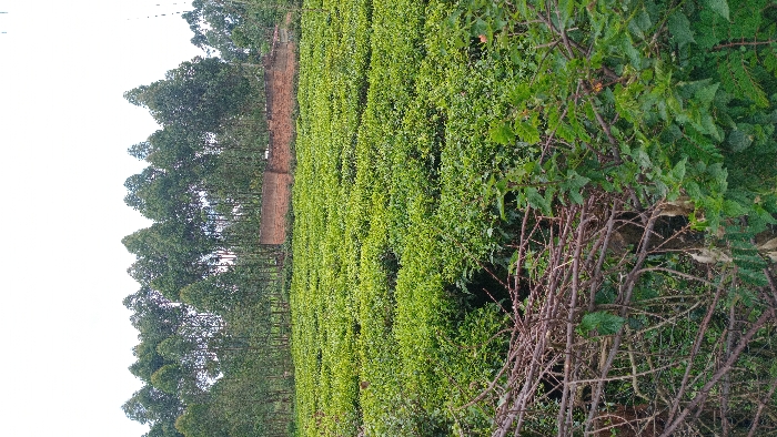 The image depicts an agricultural landscape in Gesima ward, Kenya, under an overcast sky. In the foreground, a dense cluster of dry, thorny branches and green foliage forms a natural barrier. The midground features an extensive, well-maintained tea plantation arranged in orderly rows of vibrant green bushes. In the background, a dense line of tall, slender evergreen trees, consistent with eucalyptus, stands against the horizon. Partially visible behind these trees is a low-rise structure composed of unfinished red brick walls. No individuals, animals, or specific actions are discernible within the frame.