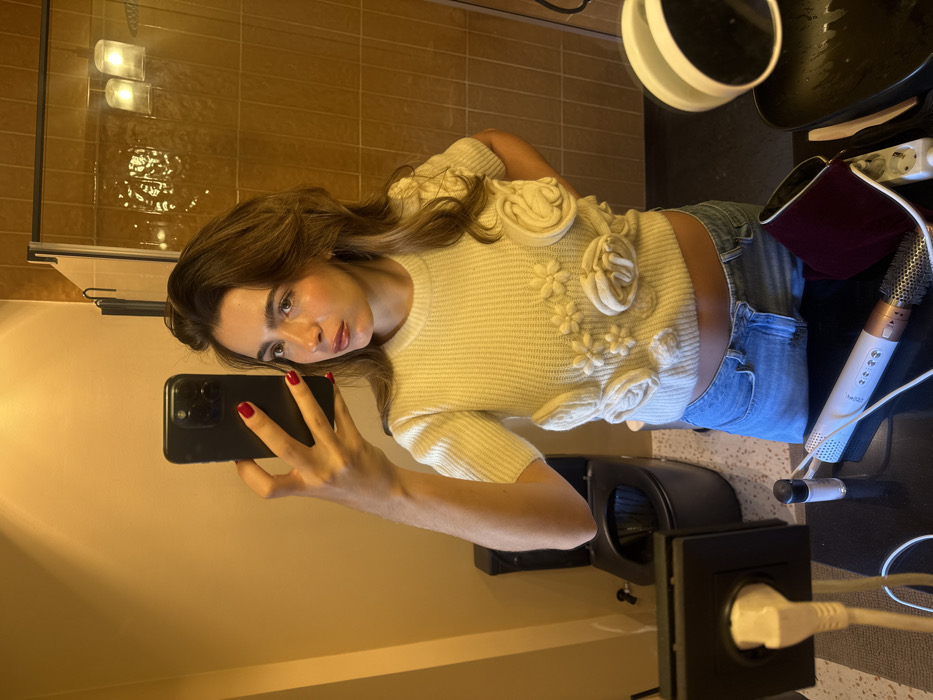 - "A young adult female, with long brown hair, wearing a cream-colored knitted short-sleeved crop top adorned with textured floral appliqués and light blue jeans, is depicted taking a mirror selfie in a bathroom in Porto, Portugal" by FM-6wyrF3, licensed under CC BY 4.0