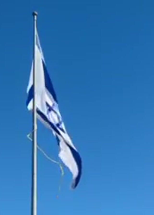 flag of Israel waving in the wind against a clear blue sky. The flag is on a silver pole and appears slightly torn at the bottom. The view is from below, looking up at the flag.