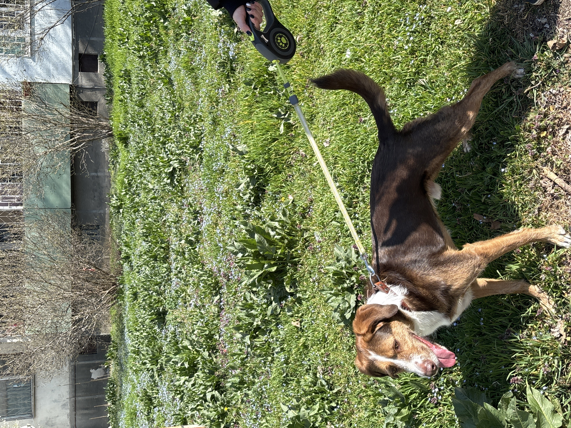 A medium-sized, tri-color dog, predominantly brown with white markings on its face, chest, and neck, stands on a sunlit grassy area in a residential neighborhood of Sofia, Bulgaria. The dog, wearing an orange-brown collar, is attached via a lime green leash to a black and grey retractable leash mechanism held by a human hand, visible on the right. The hand exhibits dark-painted fingernails. The dog's tongue is extended, suggesting panting, and it gazes towards the left. The ground is covered in bright green grass densely populated with numerous small blue/purple flowers, likely *Myosotis* species (forget-me-nots), and interspersed with larger, broader green leaves. Direct sunlight casts distinct shadows. In the background, an aging multi-story apartment building is visible. Its facade is sectioned, with parts appearing light grey and others light blue/grey, showing signs of wear. Windows on both upper floors and the darker grey ground-level foundation are secured with metal grilles. Several deciduous shrubs and trees, currently bare of foliage, are situated between the grassy area and the apartment building.