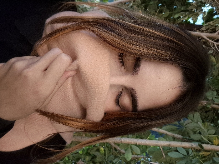 A woman with closed eyes and brown hair pulls at her cheek. Her skin is light-toned. A dark garment is partially visible. The background is an out-of-focus display of green foliage and woody branches. The image is oriented sideways, with the subject's face tilted towards the right.