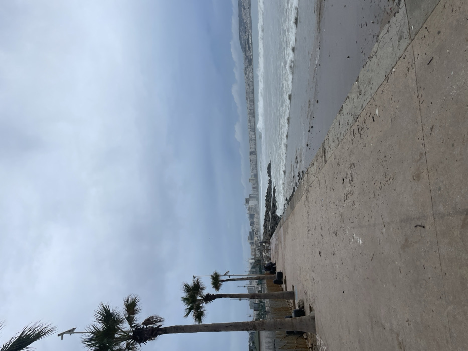 The image captures a coastal promenade along the Bay of Tangier, Morocco, on an overcast day. The scene is presented from a perspective looking along the coastline, with the sea to the right and the city to the left and in the distance. The sky is uniformly covered with dense, light to dark gray clouds, indicating a heavily overcast condition. The sea, bordering the right side of the frame, is a turbulent gray-blue with numerous white-crested waves actively breaking and rolling onto a narrow, sandy shore. The immediate shoreline appears wet and contains scattered dark debris. A line of dark gray, irregular rocks forms a partial breakwater separating the beach from the more open water. The foreground is dominated by a wide concrete promenade, exhibiting a textured, weathered surface with visible cracks, discoloration, and scattered dark granular debris, including small stones and organic matter. This promenade extends from the bottom left into the distance. Along the left edge of the promenade, a linear arrangement of tall palm trees with green fronds is visible. Three prominent palm trees stand in the foreground and midground. Between these trees are dark-colored, vertical streetlights and multiple dark, solid benches positioned to face the sea. A low, rusted-looking metal barrier or fence runs parallel to the promenade behind the line of trees. In the midground, several human figures are discernible on the promenade; one figure is seen walking away from the viewpoint. Their specific actions or interactions are not clearly identifiable due to distance. The background features a dense urban landscape of Tangier, with numerous multi-story buildings of varying architectural styles extending along the coastline and ascending into hills. The structures are predominantly light-colored. The overall environment suggests a public recreational space experiencing low activity, potentially influenced by the prevailing weather conditions.