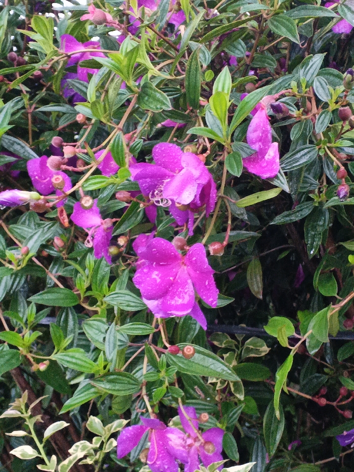 The image displays a detailed close-up of a flowering shrub in Pea Reang District, Cambodia. Numerous vibrant magenta flowers are visible, characterized by prominent white, curled stamens. These flowers are interspersed among dense clusters of dark green, ovate leaves, which exhibit distinct parallel venation. Water droplets are evident on the surfaces of both the petals and leaves, indicating a wet condition. The scene includes both fully bloomed flowers and unopened buds within the foliage. No individuals or identifiable artificial structures are present.