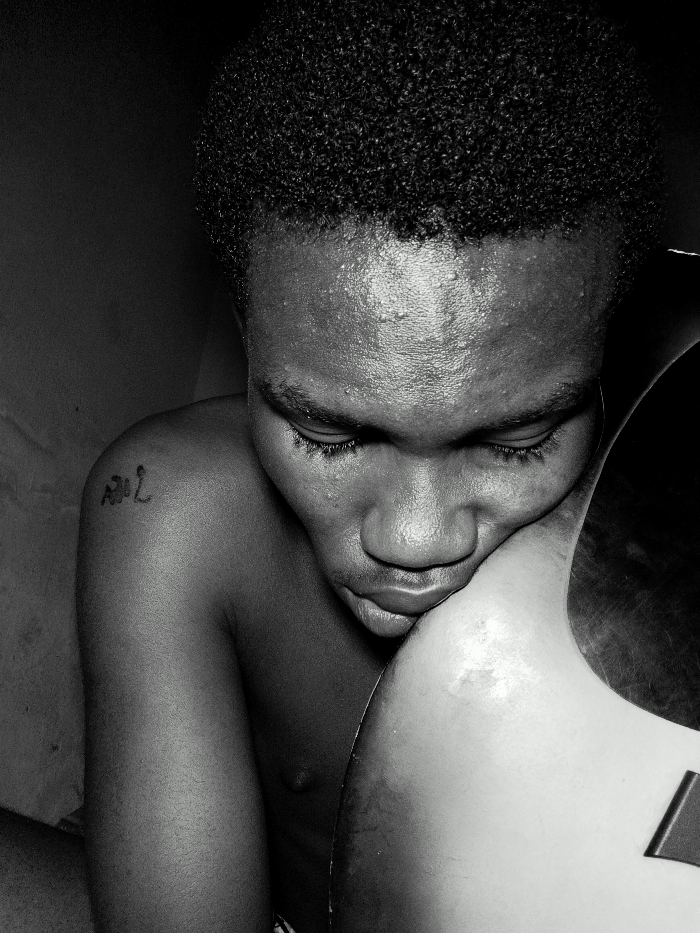 The scene, located in Keffi, Nigeria, depicts a monochromatic close-up of an individual, appearing male