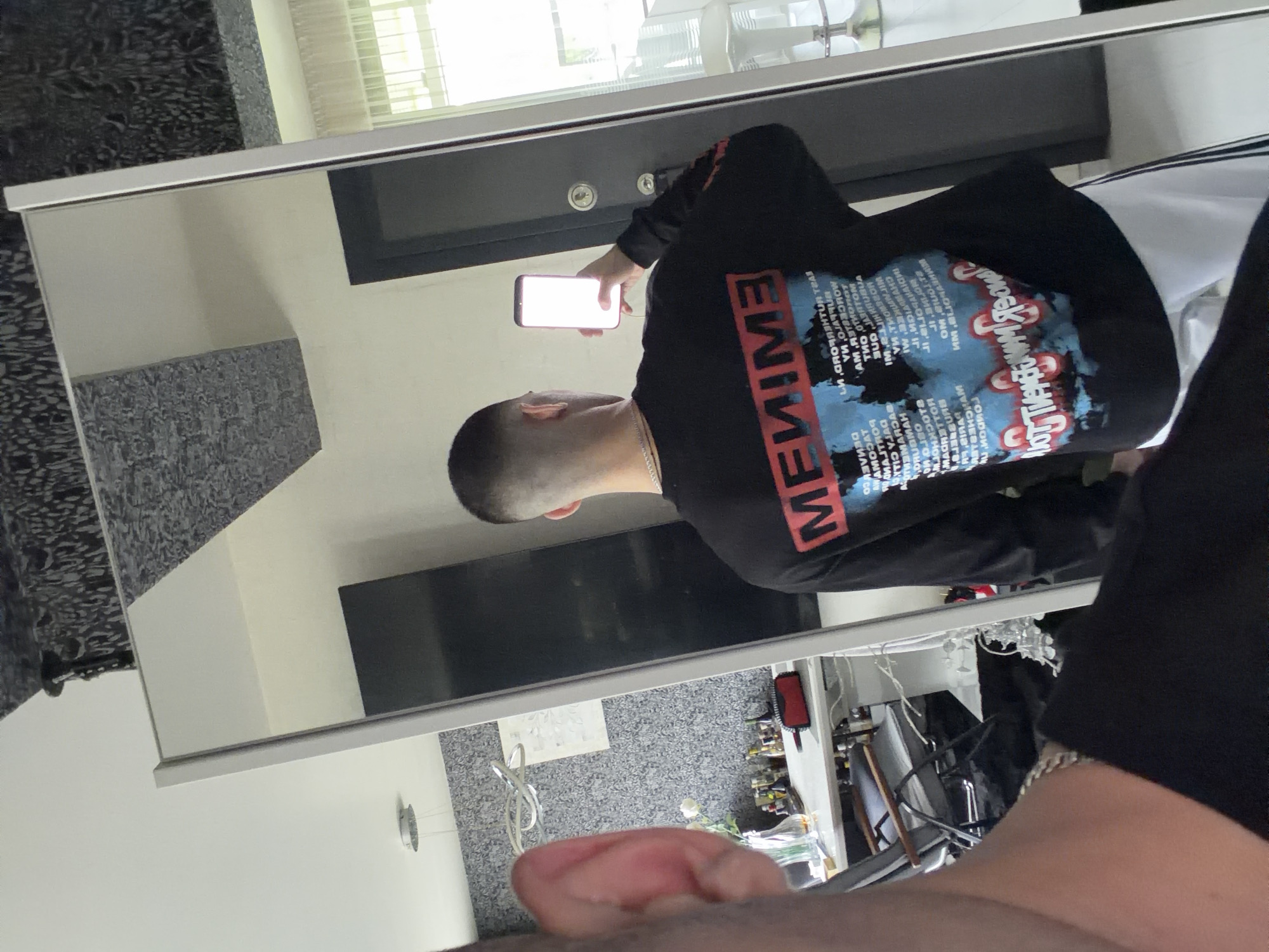 A man stands in front of a mirror, taking a photo of himself with his phone