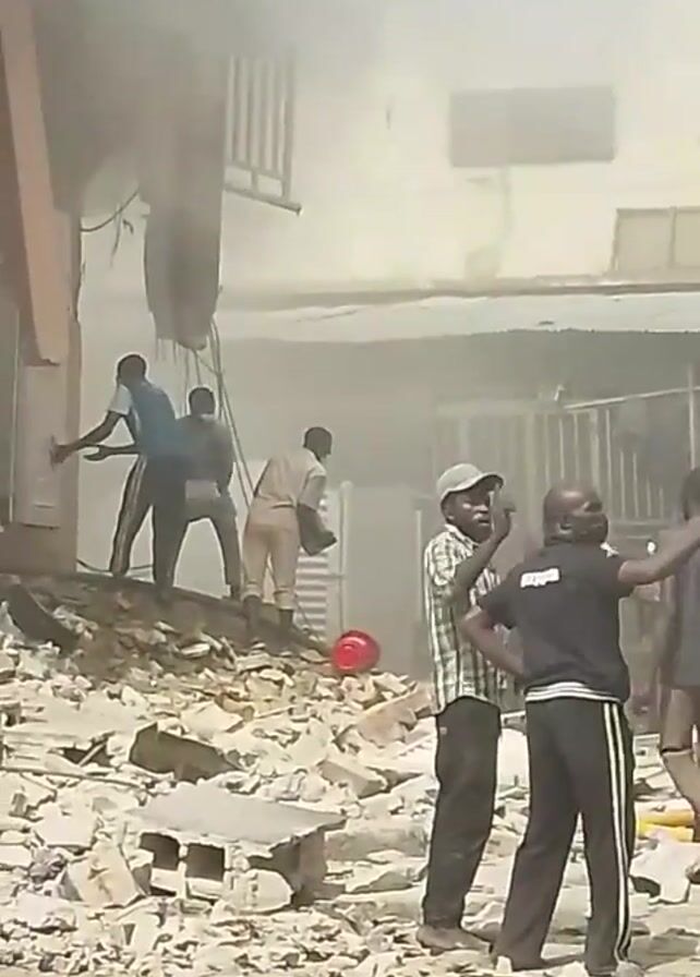 building that has partially collapsed, leaving rubble scattered around the base. There is smoke rising from the wreckage, suggesting a recent event. Several people are visible amidst the debris, some appearing to be rescuers and others possibly victims. People are working together to navigate the unstable terrain. A red hard hat lies amidst the rubble. Some individuals appear to be pulling or helping others across the debris.