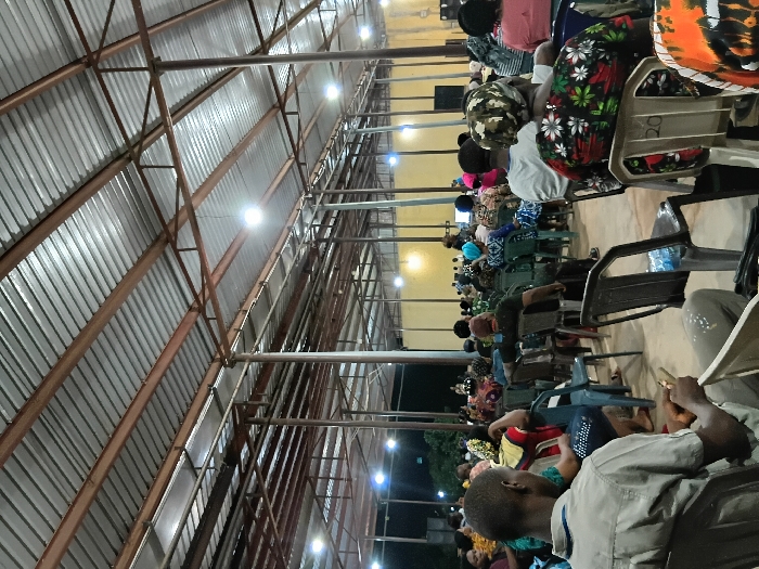 A gathering of people sit in rows of chairs under a large metal roof supported by tall beams. Overhead lighting illuminates the space. Individuals are dressed in casual clothing, and some wear patterned head coverings. The scene suggests a community event or meeting in a simple, covered area.