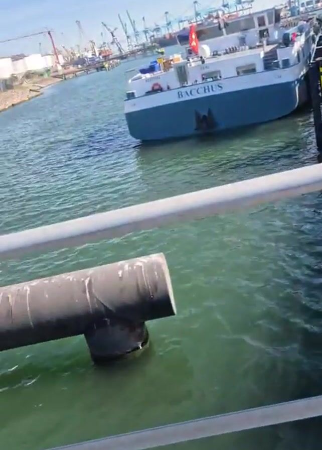 The camera, positioned behind a metal railing, pans across a port scene on a sunny day. The railing dominates the foreground, and beyond it, the focus shifts to the water, where a boat named "BACCHUS" is docked. The background reveals an industrial port landscape, dotted with cranes, storage tanks, and other infrastructural elements. The water is visibly choppy, and there are pipes and other docking support structures in the immediate vicinity of the boat. The sky is blue, with scattered clouds adding to the scene's overall composition.