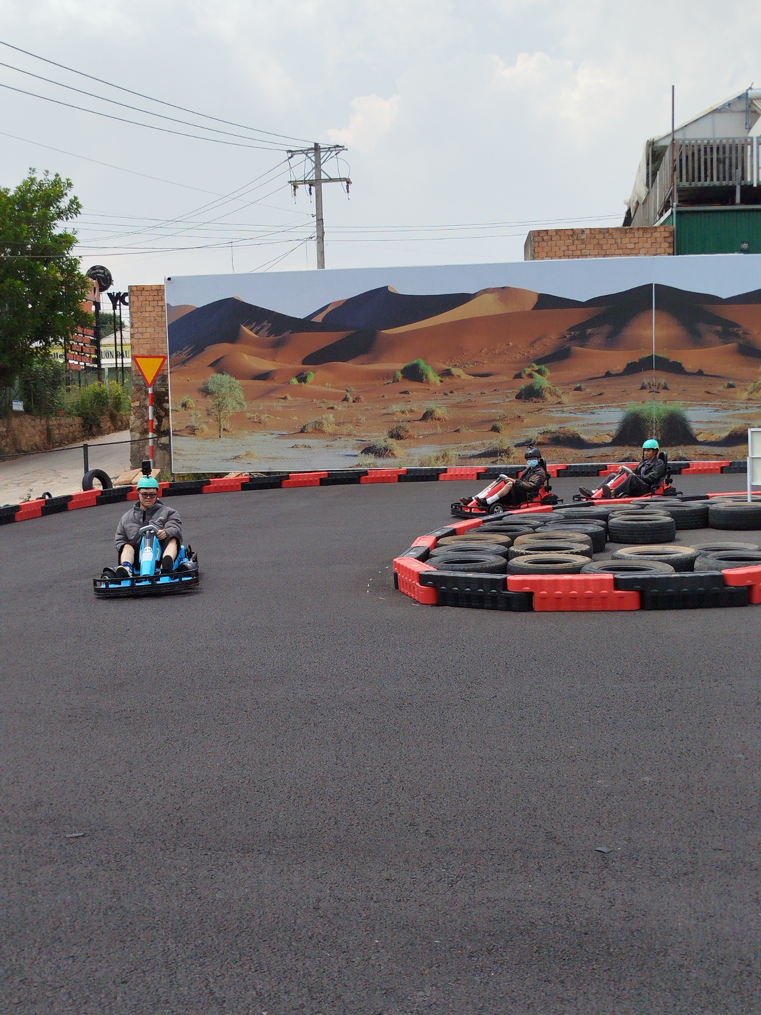 The image captures a go-kart track, likely located in Lang Biang - Đà Lạt, Vietnam, due to the presence of Vietnamese signage in the background