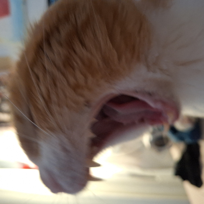 - "A close-up, distorted perspective shows an orange and white cat yawning" by FM-b0Aw43, licensed under CC BY 4.0