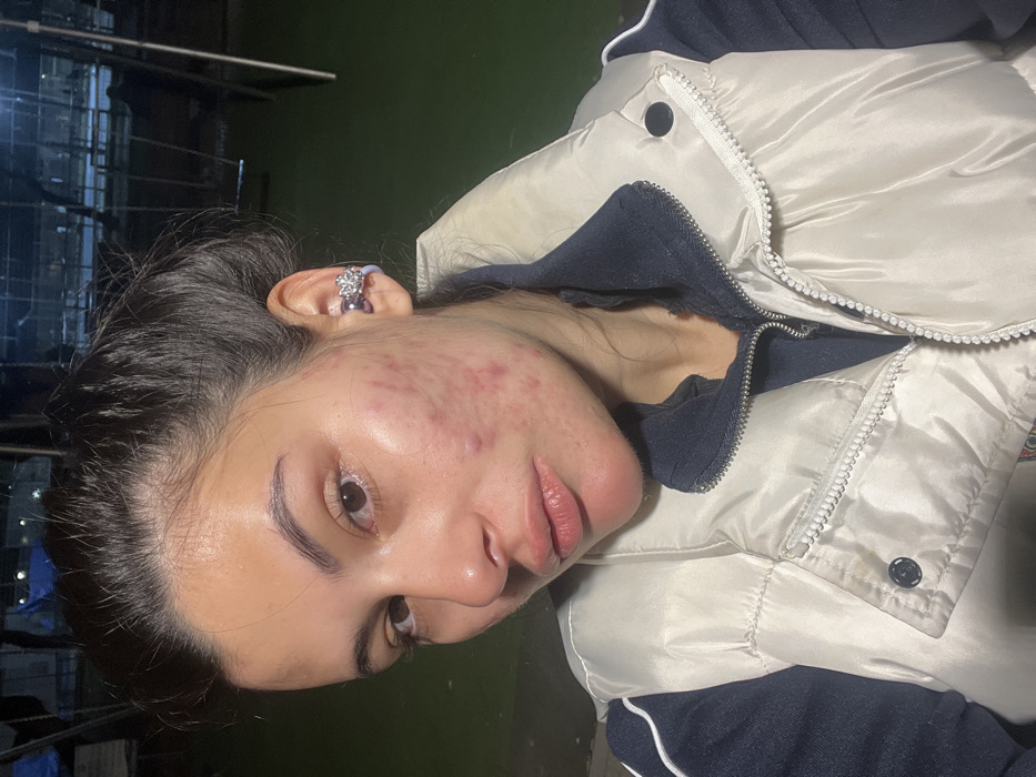 A close-up nighttime photograph depicts a female subject, estimated to be in her late teens or early twenties, positioned outdoors in a park or playground identified as being in the city of Kiryat Bialik, Israel. The woman faces the camera directly, her dark hair pulled back from her face. Her skin exhibits multiple erythematous lesions and pustules, consistent with acne, predominantly across her cheeks and jawline. On her right ear's helix, she wears a silver-toned ear cuff featuring a multi-stone cluster design. Her clothing consists of a dark blue long-sleeved garment worn beneath a cream or light beige puffer vest. The vest features a high collar, a central zipper, and two dark snap buttons on the upper chest. A small dark stain is discernible on the left chest area of the vest. The blurred background reveals outlines of metal swing frames and a green ground surface, consistent with a public park environment. No other individuals are visible or interacting with the subject.