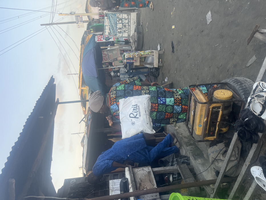 The image depicts an outdoor market scene in Badore, Nigeria, characterized by various makeshift stalls and human activity under a hazy sky