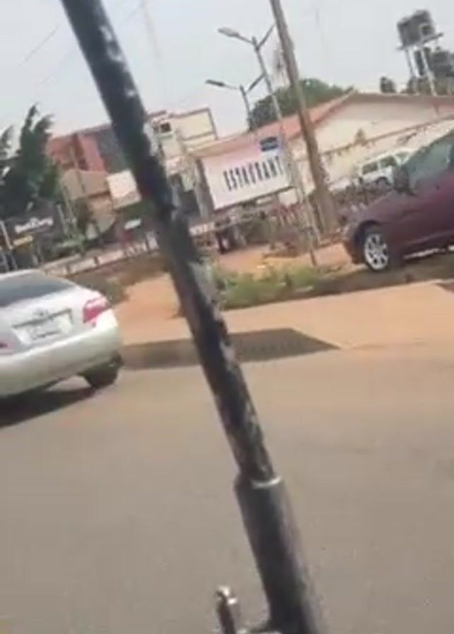 view from inside a yellow vehicle, likely a motorized rickshaw or tuk-tuk, moving along a paved road. The camera is shaky, suggesting movement. Through the metal frame of the vehicle, the scene outside includes other vehicles, a silver Toyota Camry, parked cars, and a pedestrian in a red patterned shirt walking along the sidewalk. There are buildings and billboards in the background, including one for "BetKing". Utility poles and trees are also visible against a mostly clear sky.