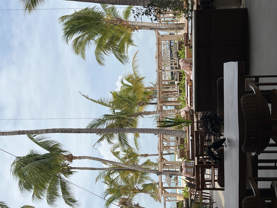 A beachfront setting showcases tall palm trees reaching into a partly cloudy sky. A restaurant or bar area is visible with wooden chairs and tables, along with decorative wooden structures leading towards the beach. Some pink cushions or decorative elements are present. Two dark-colored birds stand on a table in the foreground.