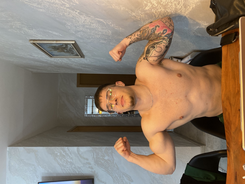 A male individual, approximately mid-20s, with short brown hair, a goatee, and clear-framed glasses, is depicted shirtless, flexing both biceps with clenched fists, and looking directly at the camera
