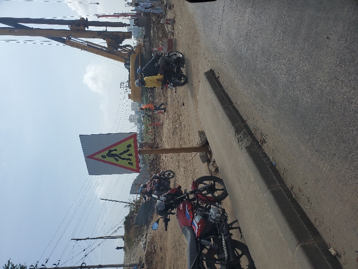 A pedestrian crossing sign stands near a construction site with heavy machinery. Two motorcycles are parked nearby, one red and one dark colored. A road runs adjacent to the construction zone, with a curb separating it from the dirt area. Utility poles with wires are visible in the background, and buildings can be seen in the distance. Workers in orange vests are present at the site.