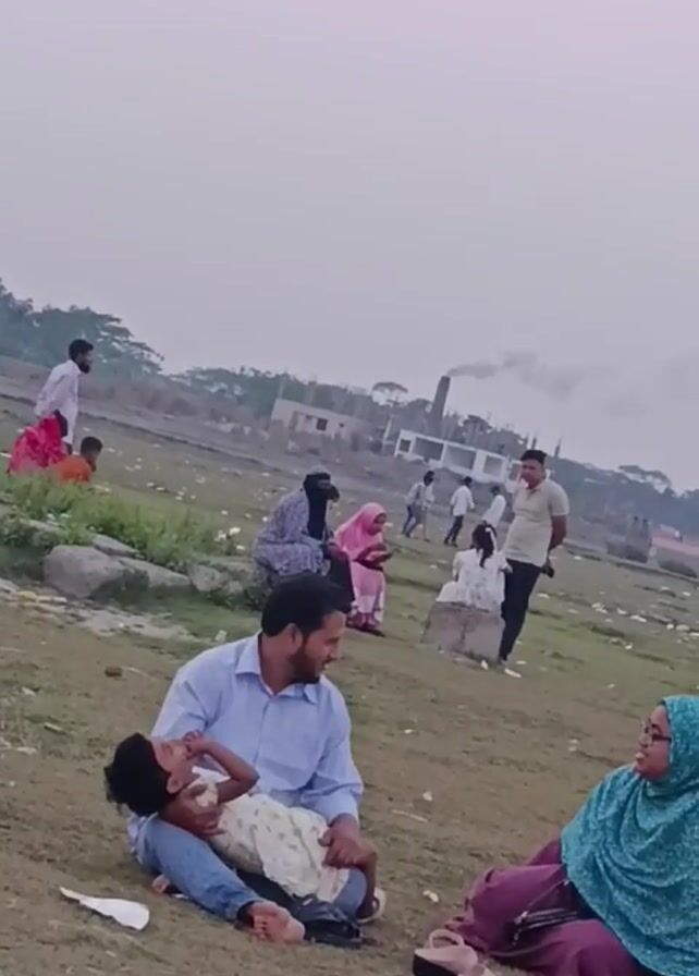 The scene depicts a family enjoying an outdoor setting on a grassy field. A man wearing a light blue shirt and jeans is sitting on the ground, holding a young child in his lap. The child is wearing a white patterned dress. A woman, draped in a turquoise hijab, is sitting nearby, engaging in conversation with the man. In the background, several other people are scattered around the field. Some are walking, others are sitting. There is a building with a smokestack visible in the distance, with smoke rising from it. The sky is overcast and the environment appears to be a somewhat polluted area near an industrial site.